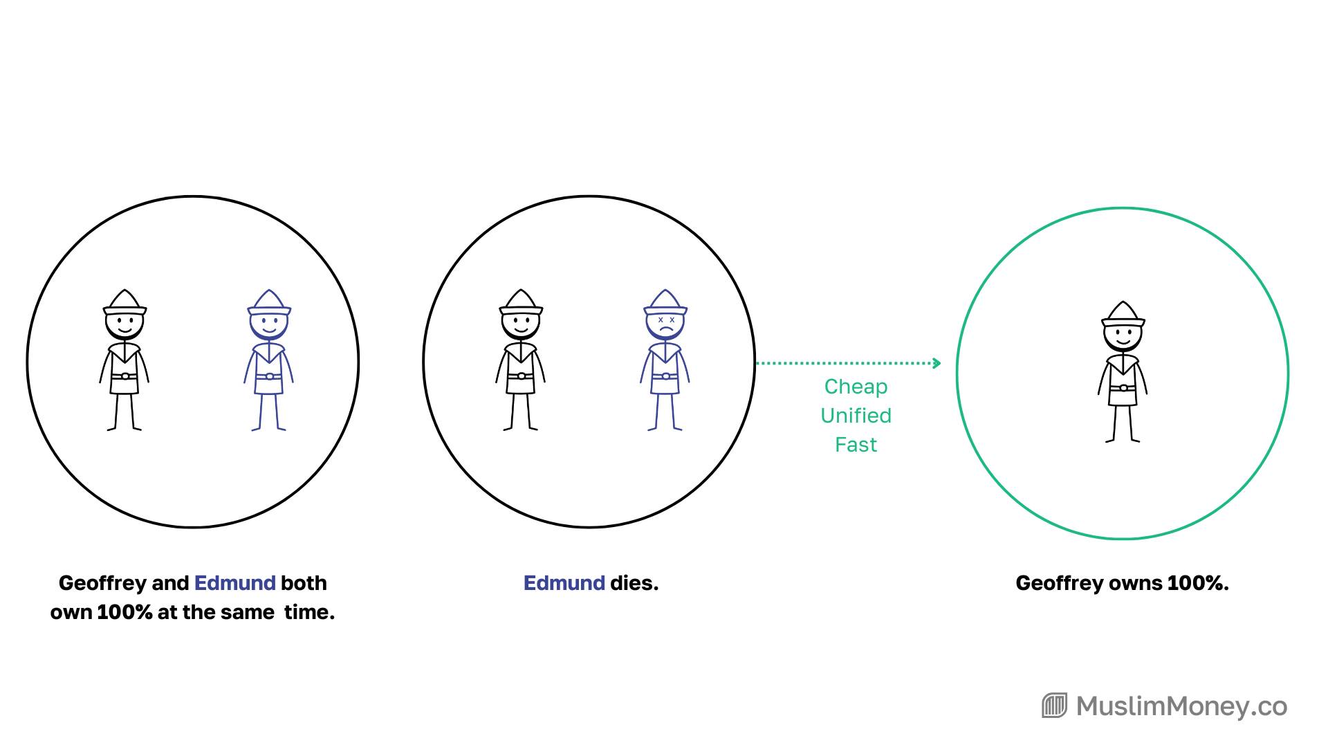 The medieval legal fiction activates. Because they were “one person,” and that person still exists (as Aisha), Ibrahim’s share doesn’t enter his estate. It vanishes. Aisha becomes sole owner of the entire $500,000 property automatically.