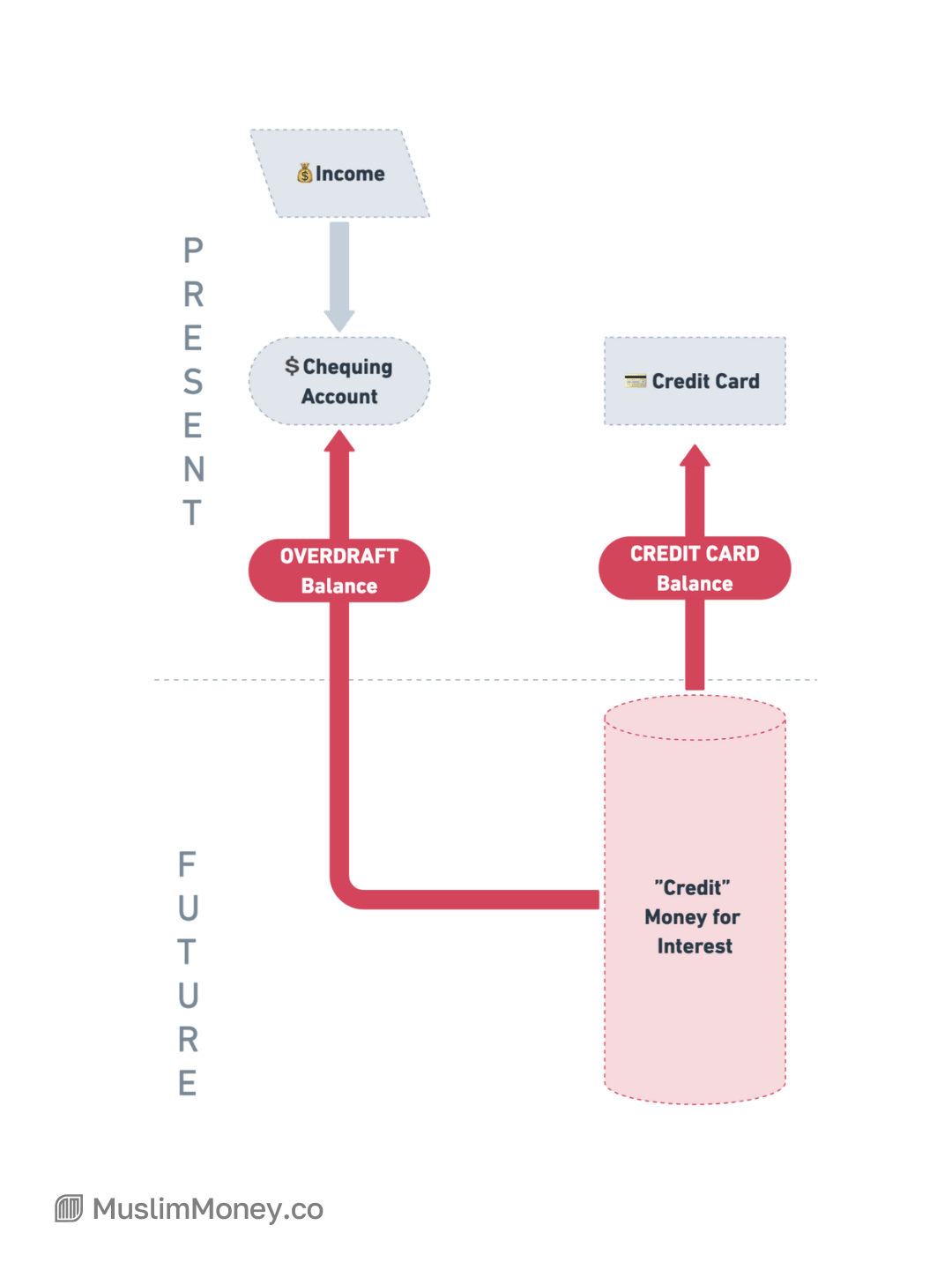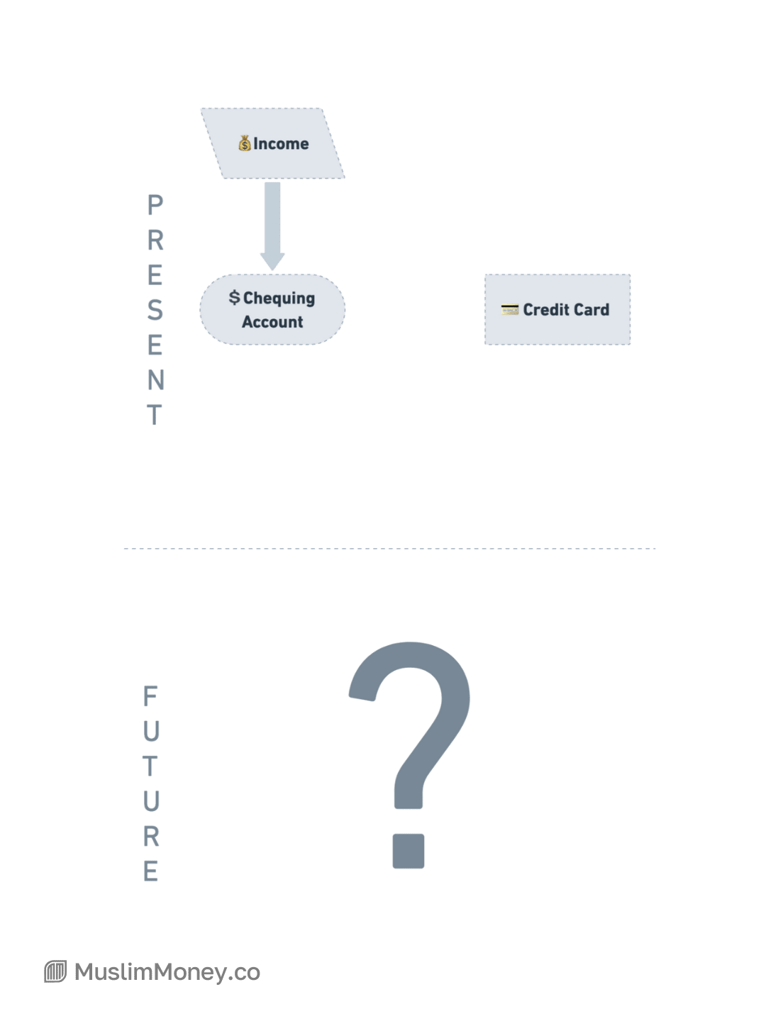 The most common banking structure for Muslims includes a chequing account (and maybe a credit card) where money for this month and money for the future sit together, without any separation.